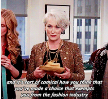 Again, I understand that it is an extremely small number surveyed, however, these answers tell me that people aren’t jumping out to buy what they saw after a fashion show. (It’s also not as streamlined as that; the trends start out more avant-garde then trickle down to more commercialized pieces, and then trickle down to even more commercialized items for the mass market. Remember Meryl Streep and Ann Hathaway in the blue sweater scene from The Devil Wears Prada?)